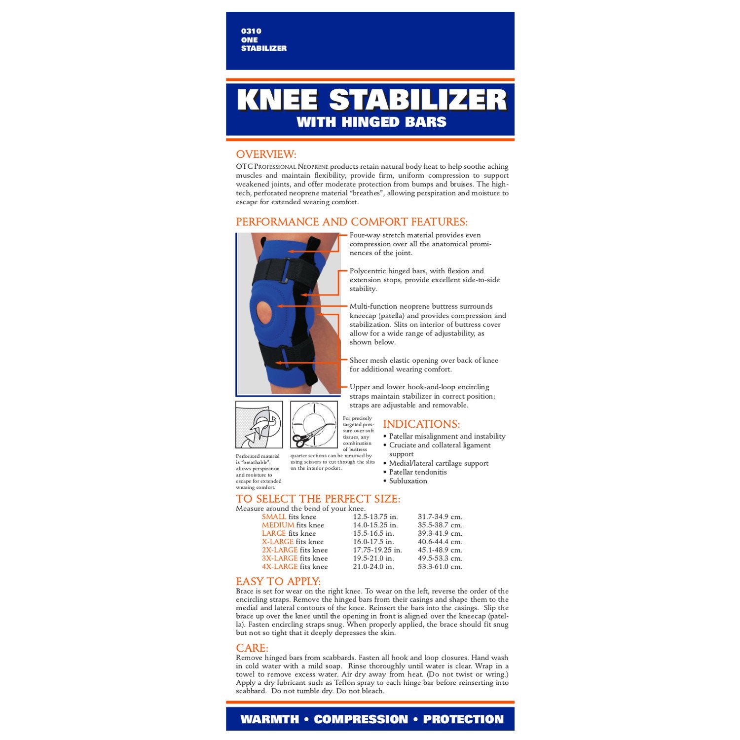 The OTC 0310 knee stabilizer retains natural body heat to help soothe aching muscles and provide firm, uniform compression to support a weakened knee, and offers moderate protection from bumps and bruises. The high-tech, perforated material “breathes”, allowing perspiration and moisture to escape for extended wearing comfort. Handcrafted construction includes invisible stitching and heat seal seam tape for added comfort and durability. Effective support and value to keep you comfortably active. Excellent for use in athletics and occupational activities.