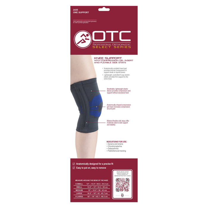 The OTC 2435 Knee Support with Compression Gel Insert and Flexible Stays features anatomically contoured compression gel insert pads to provide targeted, precise compression to support weak or injured soft tissue around the joint. The elastic fabric material is lightweight and breathable with a four-way stretch that molds around the bony prominences of the joint. The compression gel inserts support natural motion in the joint and provides for an optimum fit.