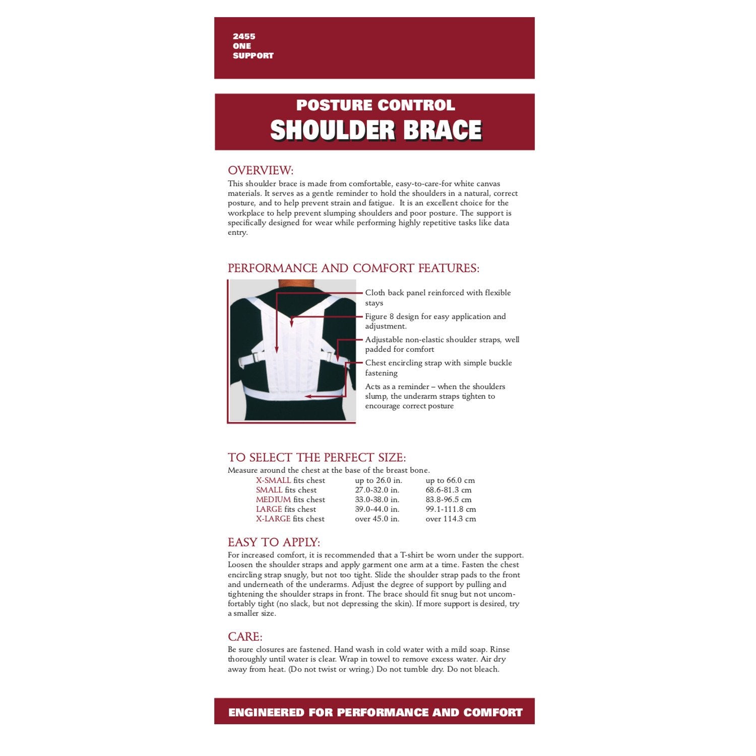 The OTC 2455 posture control shoulder brace is made from comfortable, easy-to-care-for white fabric. It serves as a gentle reminder to hold the shoulders in a natural, correct posture, and to help prevent strain and fatigue. It is an excellent choice for the workplace to help prevent slumping shoulders and poor posture. The support is specifically designed for wear while performing highly repetitive tasks like data entry.