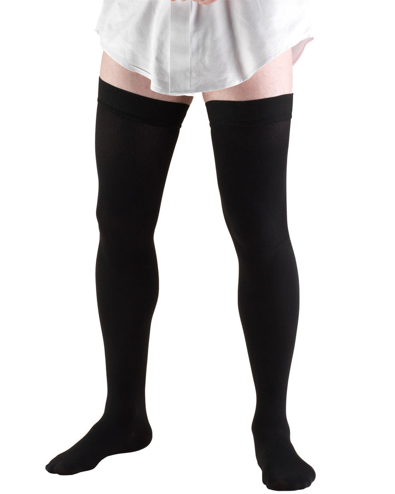 Second Skin Men's 20-30 mmHg Dress Thigh High Compression Socks are available in black. Sold per pair. Second Skin Men's thigh high dress socks are designed to improve leg circulation and reduce leg discomfort throughout your day. The thigh high length provides support well above the knee. Manufactured from microfiber nylon to provide soft comfort that is cooler to wear than standard nylon. An attractive rib-knit pattern make these socks a perfect choice for business, or business-casual wear.