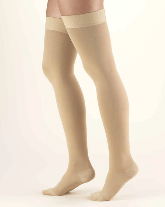 Contrary to popular belief, your medical support hose don't have to be uncomfortable, as a sign that they're working. If you're looking for effective medical hosiery, these Second Skin thigh high medical stockings might be your perfect fit. They feature a state-of-the-art silicone dot top band and an overall comfortable wearing experience.
